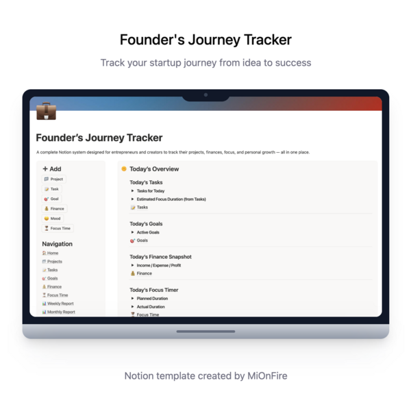 At MiOnFire, we create Notion templates for founders and freelancers who want clarity, focus, and growth. Our tools help you track projects, finances, goals, and emotions — all in one place.