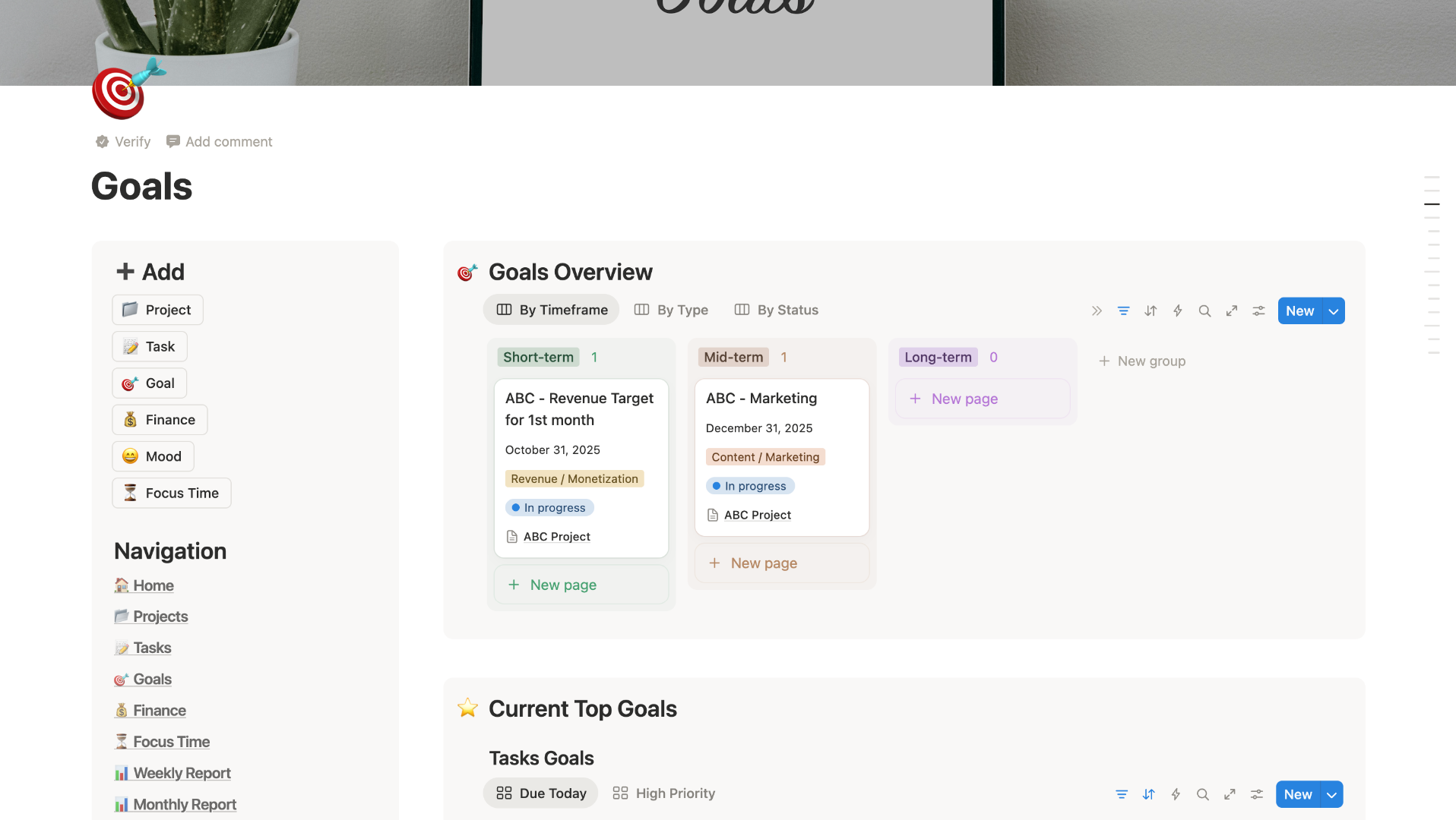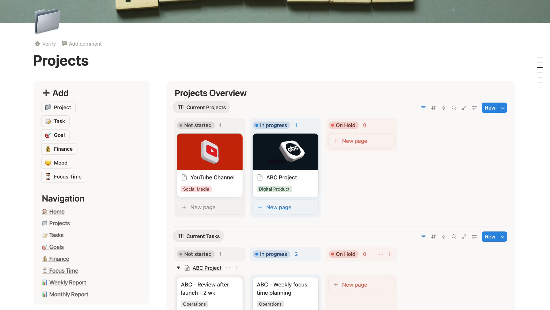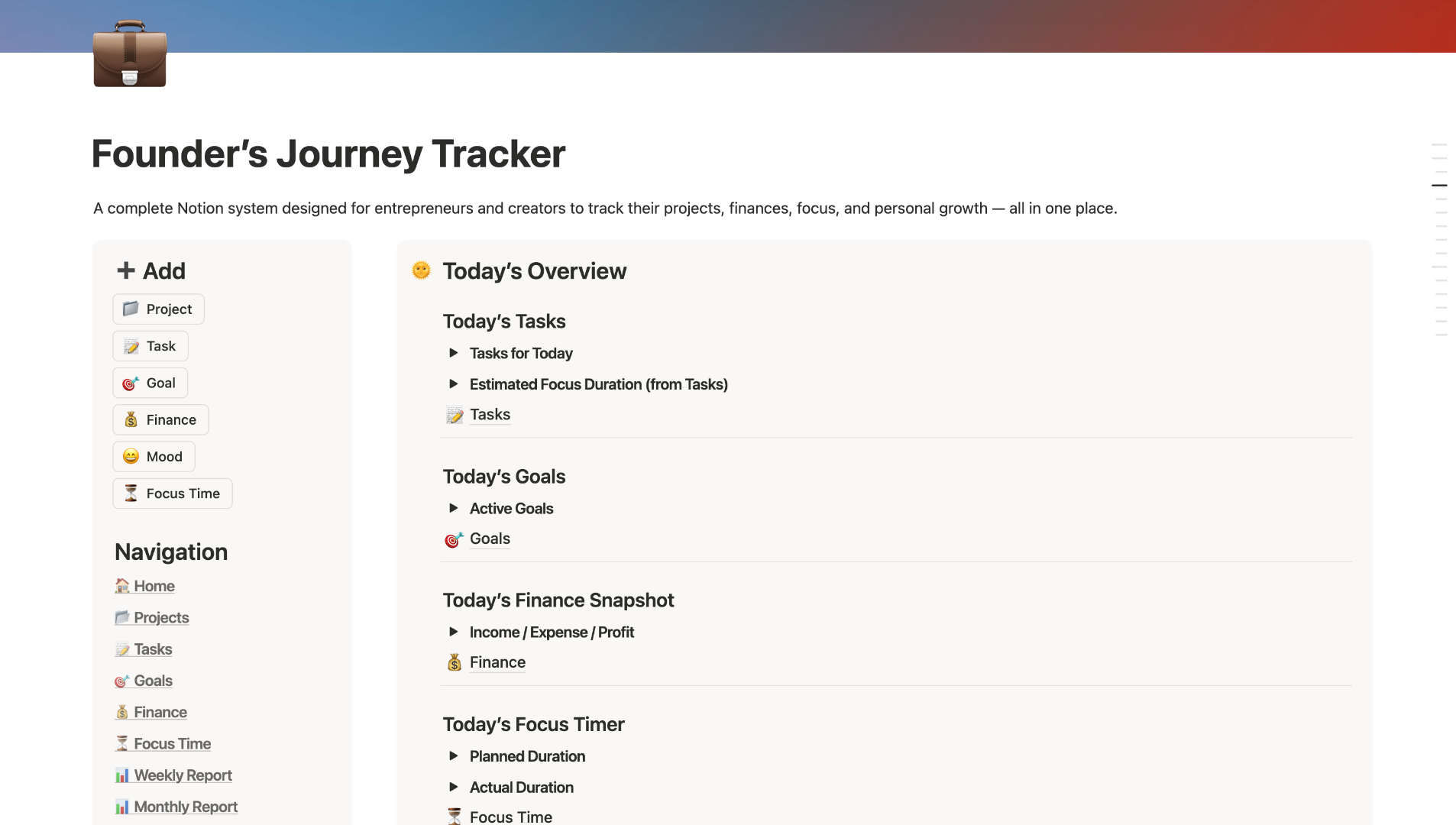 A complete Notion system designed for entrepreneurs and creators to track their projects, finances, focus, and personal growth — all in one place.