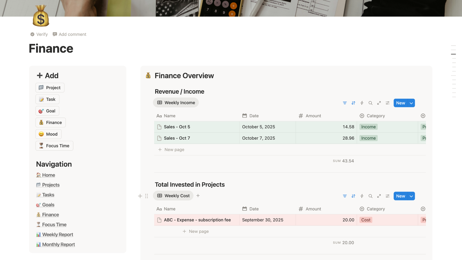 Finance Overview: Track income, expenses, and cashflow in one dashboard.